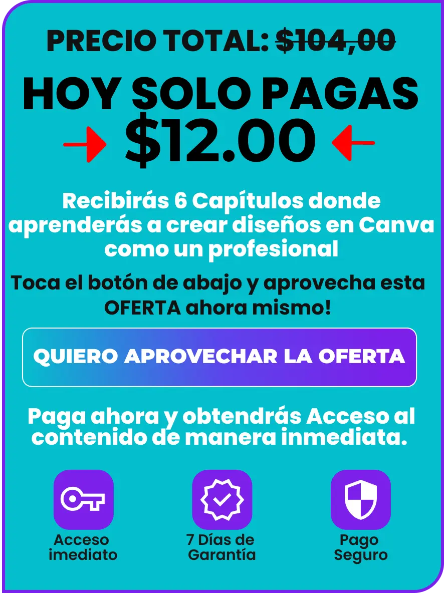 Con Canva Cash no tienes riesgos. Prueba el programa durante 7 días y, si no cumple tus expectativas, solicita un reembolso completo sin preguntas. Queremos asegurarnos de que confíes plenamente en este producto y obtengas las herramientas necesarias para alcanzar tus objetivos creativos y profesionales.